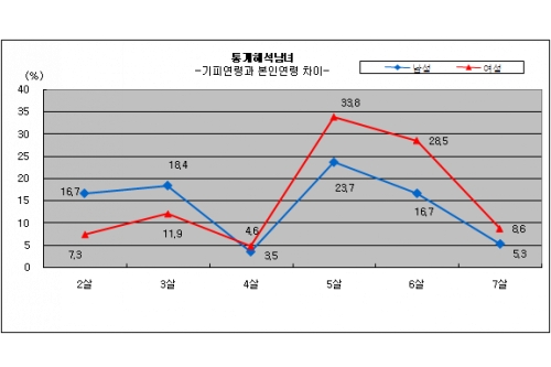 기피연령과 본인연령의 차이를 살펴보면 남녀 모두 4살을 기점으로 해서 양쪽으로 날개처럼 펼쳐지는 분포양상이 비슷한 가운데 남녀가 기피하는 정도가 다소 달라진다.