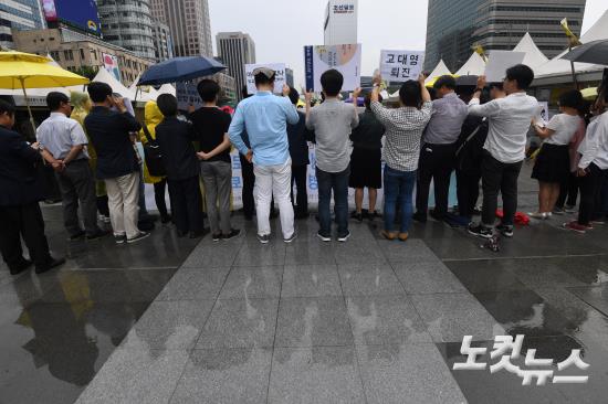 시민사회단체 회원들이 6일 오후 서울 광화문광장에서 열린 기자회견에서 공영방송 정상화를 위한 총파업을 지지하며 KBSㆍMBC 경영진 퇴진을 촉구하고 있다.