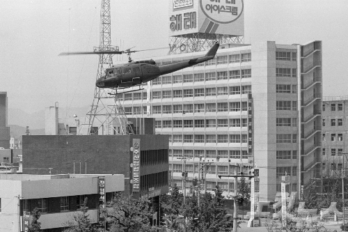 80년 5.18 당시 군 헬기가 전일빌딩 주변을 비행하고 있다. (사진=5.18기념재단 제공)