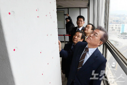 문재인 대통령이 윤장현 광주광역시장 및 5.18 단체 대표 등과 후보 시절 전일빌딩 헬기 사격 탄흔 현장을 찾았다. (사진=광주광역시 제공)