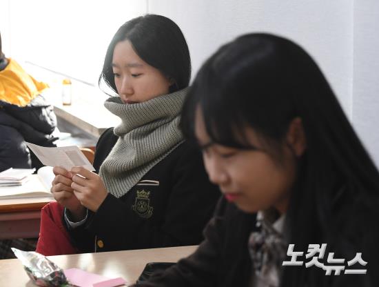 2018학년도 수능을 하루 앞둔 15일 오전 서울 마포구 서울여고에서 수험생들이 수험표를 확인하고 있다.