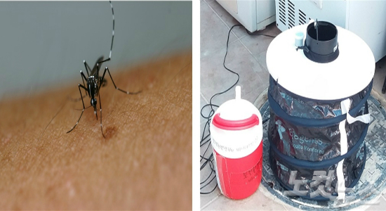 지카바이러스 매개체인 흰줄숲모기와 모기 채집 장비 (사진=부산시 제공)