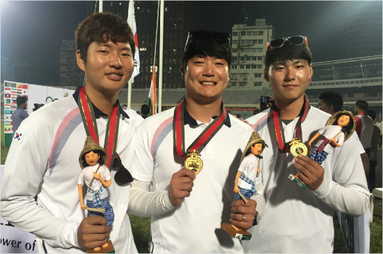 양궁 남자 리커브 단체전 금메달을 딴 김종호(왼쪽부터), 이승윤, 이우석. (사진=대한양궁협회 제공)