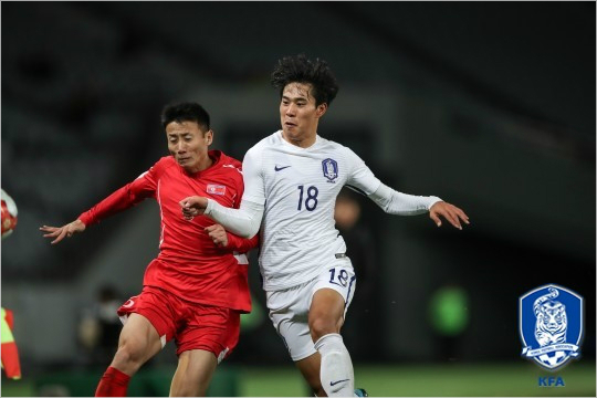 한국 축구는 지난 중국전(2-2무)과 달라진 선수 구성으로 북한전에 임했다. 3-4-3 전술을 선택한 신태용 감독은 A매치 경험이 없는 진성욱을 최전방 공격수로 두고 김민우(수원)와 이재성(전북)을 측면에 배치하는 스리톱을 실험했다.