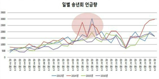 2013년도와 2014년도는 12월 송년회 일별 언급량 그래프의 폭이 비교적 큰 반면, 2015년과 2016년도는 그래프의 폭이 적은 것을 볼 수 있습니다.