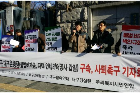경찰이 박인규 대구은행장에 대한 구속영장을 신청한 가운데 시민단체가 박 행장의 구속과 해임을 촉구하고 나섰다.