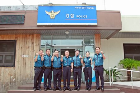 지역 경찰을 방문한 김영옥 제주지방경찰청 생활안전계장. 오른쪽에서 두번째 (사진=제주지방경찰청 제공)