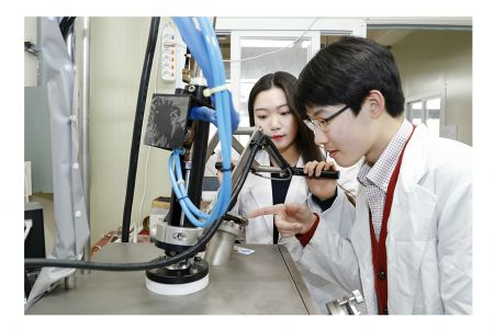 영남대 신소재공학부 4학년 신윤지, 이동희 씨가 특허등록한 용융장치를 활용해 연구를 수행하고 있다.(사진=영남대 제공)