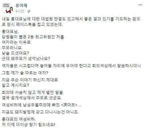 류 최고위원은 21일 "내일 홍 대표님에 대한 대법원 판결도 있고 해서, 좋은 결과 있기를 기도하는 맘으로 잠시 페이스북을 접고 있었는데…당원들이 뽑은 2등 최고위원인 저를 여자라는 이유로 주모라니요?"라며 "낮술 드셨나. 여자들은 시끄럽다며 놓아둘 자리에 두어야 한다고 말씀하시더니 그럼 제가 술 따르는 여자? 지금 무슨 이야기 하신 지 제대로 알고 계시지요?"라며 맹비난했다.