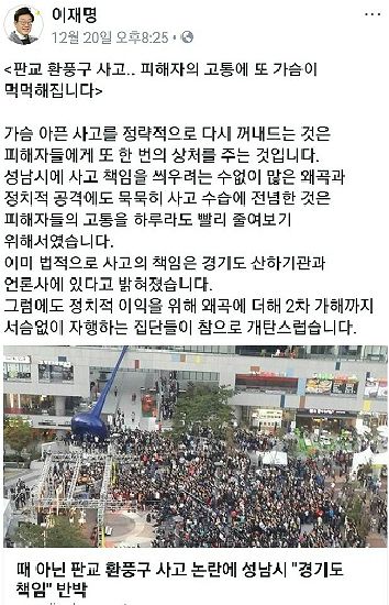 이 시장은 이 글에서 "성남시에 사고 책임을 씌우려는 수 없는 많은 왜곡과 정치적 공격에도 묵묵히 사고 수습에 전념한 것은 피해자들의 고통을 하루라도 줄여보기 위해서였다"고 밝혔다.
