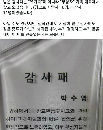 그는 해당 글을 통해 "일부 언론에서 성남시청 게시판에 올려져 있다는 김모 부상자가족대표의 글을 바탕으로 한 비난이 이어지고 있어 팩트를 밝힌다"며 "시 홈페이지에 글을 올린 김모 부상자가족대표란 분이 나에게 감사패를 가져온 그 분" 이라고 강조했다.