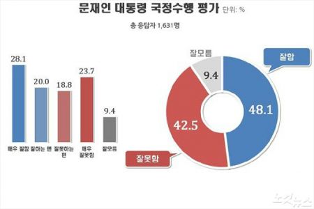 문재인 대통령 국정 수행 지지도에 대한 평가에서는 TK지역에서도 긍정평가가 부정적 평가보다 높았다.문 대통령의 국정수행에 대해 어떻게 평가하느냐에 대한 질문에 응답자의 28.1%가 매우 잘한다고 답했고 잘하는 편이라고 답한 사람의 비율도 20%로 긍정적 평가가 48.1%였다.매우 잘못한다고 응답한 비율은 23.7%,잘못하는 편이라고 답한 비율은 18.8%로 부정적 평가는 42.5%에 그쳤다.지역별로는 대구가 긍정적 평가 비율이 과반을 넘는 51%였고 경북에서는 잘하는 편이 45.4% 잘못하는 편은 45.1%로 팽팽했다.연령대별로는 40대 이하에서 긍정적 평가가 65.5%로 압도적이었고 50대 이상에서는 잘못하는 편이라는 부정적 평가가 과반을 넘는 59.1%로 나타났다.성별로는 남성은 부정적 평가가 조금 높은 48.4%였고 여성은 긍정적 평가가 49.8%로 부정적 평가 36.8%보다 높았다.