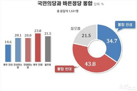 국민의당과 바른정당의 통합에 대한 질문에 대해서는 반대 의견이 찬성보다 높았다.통합에 매우 찬성한다는 응답은 14.6%,찬성하는 편은 20.1%로 찬성 의견은 34.7%에 그쳤다.반면 매우 반대는 23.8%,반대하는 편은 20%로 반대 의견이 43.8%로 나타났다.지역별로는 대구보다 경북에서 찬성 의견 비율이 조금 더 높았다.경북의 통합 찬성 의견 비율은 35.9%였고 대구는 33.6%로 조사됐다.지지정당 별로는 민주당과 한국당 지지자들의 반대 응답 비율이 각각 50.3%와 50.6%로 나타났다.통합 당사자인 국민의당 지지자들 가운데는 찬성 비율이 55.7%,반대는 39.9%였고 바른정당 지지자들의 통합 찬성 비율은 67.7%,반대는 25.3%였다.