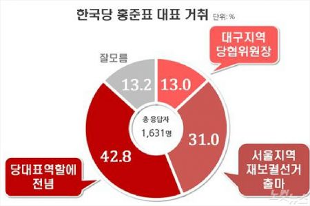 자유한국당 홍준표 대표가 대구지역 당협위원장을 맡는 것과 내년 6월 서울지역 재보궐 선거에 출마하는 것 중 어떤 결정이 가장 바람직하다고 생각하느냐에 대한 질문에 대해서는 서울지역 재보궐 선거 출마가 바람직하다고 응답한 비율이 31%,대구지역 당협위원장을 맡아야 한다는 응답은 13%에 그쳤다.당 대표 역할에 전념해야 한다는 응답은 42.8%로 가장 높았다.자유한국당 지지자들 가운데서도 대구지역 당협 위원장을 맡아야 한다는 응답은 24.1%에 그쳤고 서울지역 재보궐선거에 출마해야 한다는 응답은 39.8%,당 대표 역할에 전념해야 한다는 응답도 28.5%로 나타났다.