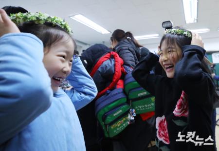 2018학년도 초등학교 예비소집일인 8일 오후 서울 용산구 용암초등학교 예비 신입생들이 교장 선생님이 씌어준 화관을 쓰고서 환하게 웃고 있다.