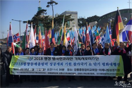 기독서포터즈단 300여 명은 강릉중앙감리교회를 출발해 빙상 경기가 열리는 강릉아이스아레나까지 참가국 깃발을 앞세우고 행진했다. 참가국 깃발 중에는 북한 인공기도 눈에 띄었다.