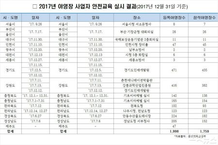 그런데 자유한국당 김무성 의원이 문체부로부터 제출받은 17년도 야영장 안전교육 자료에 따르면 전국 등록야영장 중 안전교육을 받은 야영장은 총1,998개소 중 1,759개소로 약 88%에 이르며 현재 등록야영장 중 약 12%가량은 안전교육을 받지 않은 채 영업을 하고 있다.