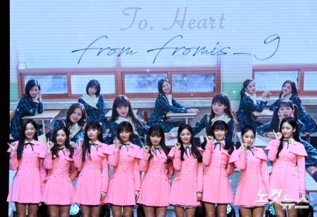 9인조 신인 걸그룹 프로미스나인이 24일 오후 서울 중구 신세계 메사홀에서 첫 번째 미니앨범 ‘To. Heart' 발매 쇼케이스를 갖고 취재진을 향해 포즈를 취하고 있다.