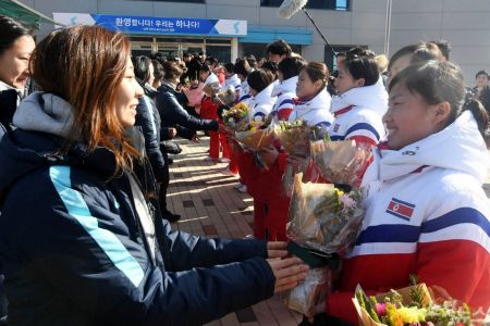 평창동계올림픽에서 단일팀으로 출전할 북한 여자 아이스하키 선수단이 25일 오후 충북 진천 국가대표선수촌 빙상훈련장에 도착해 환영식을 갖고 있다. (사진=사진공동취재단)