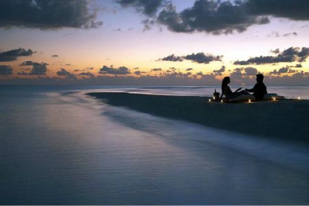 전용 샌드뱅크에서 둘만의 로맨틱 디너를 즐길 수 있는 포시즌 란다기라바루 리조트. (사진=허니문리조트 제공)
