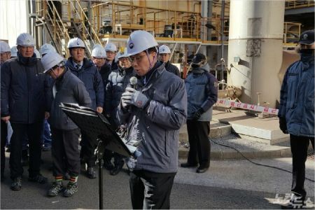이성기 고용노동부 차관(가운데)이 25일 포스코 포항제철소 질식사고 현장을 찾아 제철소 관계자로부터 브리핑을 받고 있다. 문석준기자