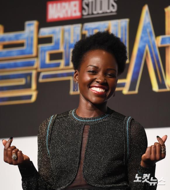 5일 서울 광화문 포시즌스호텔에서 열린 영화 '블랙팬서' 아시아 프레스컨퍼런스에서 루피타 뇽이 포즈를 취하고 있다.