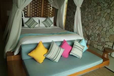 은은한 에메랄드빛 침구로 꾸며진 나트랑 미아 리조트 침실 인테리어. 전통 베트남 스타일에 모던한 감성을 더했다. (사진=베트남스토리 제공)