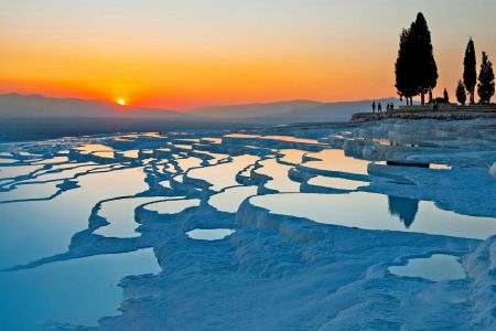 돌무쉬(Dolmus, 미니버스)를 타고 멀리서 바라보면 흡사 빙산이나 설산 같다. 석회를 머금은 물이 흘러내리면서 그 성분들이 층을 이뤘고 층마다 푸른 물을 머금고 있다. 맑은 날이면 석회층은 물과 함께 청아하게 빛난다.