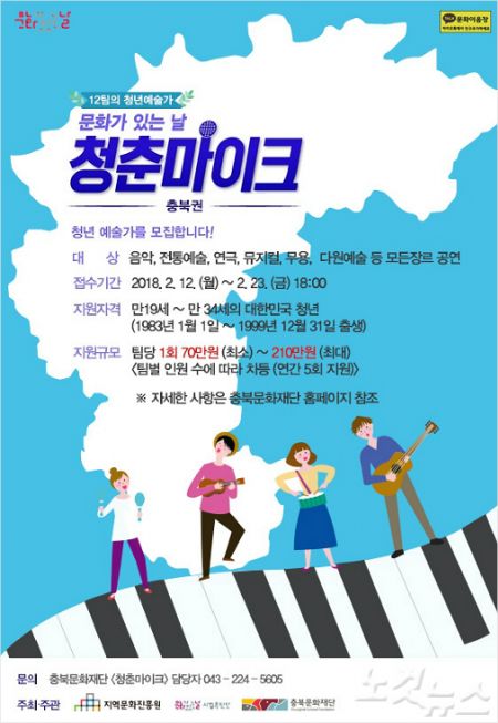 충북문화재단이 문화가 있는 날 '청춘마이크' 무대를 꾸려갈 청년 예술가를 모집한다.