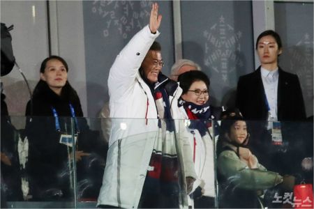 귀빈석에 앞뒤로 앉았던 문재인 대통령, 김정숙 여사와 김영남 북한 최고인민회의 상임위원장, 김정은 노동당 위원장 여동생 김여정 당 중앙위 제1 부부장은 동시에 일어나 남북한 선수단에게 힘찬 박수를 보냈다.