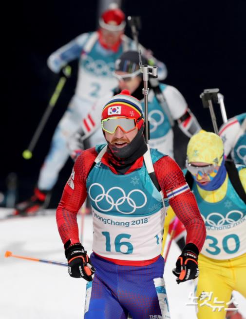 12일 오후 강원도 평창 알펜시아 올림픽파크 내 바이애슬론 센터에서 열린 남자 추적 12.5km 경기에 출전한 러시아 귀화 한국 대표선수 티모페이 랍신이 설원을 질주하고 있다.