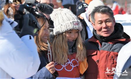 13일 강원도 평창 휘닉스 스노 경기장에서 열린 2018 평창동계올림픽 스노보드 여자 하프파이프 결선에서 금메달을 차지한 클로이 김(미국)이 아버지 김종진, 어머니 윤보란 씨와 기쁨을 나누고 있다.