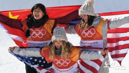13일 강원도 평창 휘닉스 스노 경기장에서 열린 2018 평창동계올림픽 스노보드 여자 하프파이프 결선에서 금메달을 차지한 클로이 김(미국)이 은메달 리우지아위, 동메달 아리에 골드와 시상대에서 기념 촬영을 하고 있다.