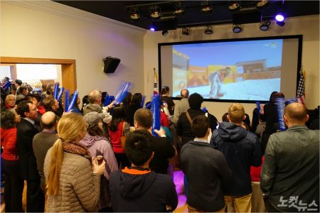 12일(현지시간) 미국 워싱턴 한국문화원에서 열린 평창동계올림픽 응원행사에 많은 미국인들이 참가해 클로이 김 선수를 응원하고 있다. (사진=워싱턴 장규석 특파원)