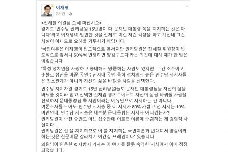 이 시장은 이날 페이스북에 '전해철 의원님 오해 마십시오'라는 글을 올려 "경기도 '민주당 권리당원 15만명이 다 문재인 대통령을 지지하는 것은 아니다'고 이재명이 발언한 것을 전제로 이런저런 걱정을 하고 계시는데, 그건 사실이 아니므로 오해를 거두시기 바란다"고 했다.
