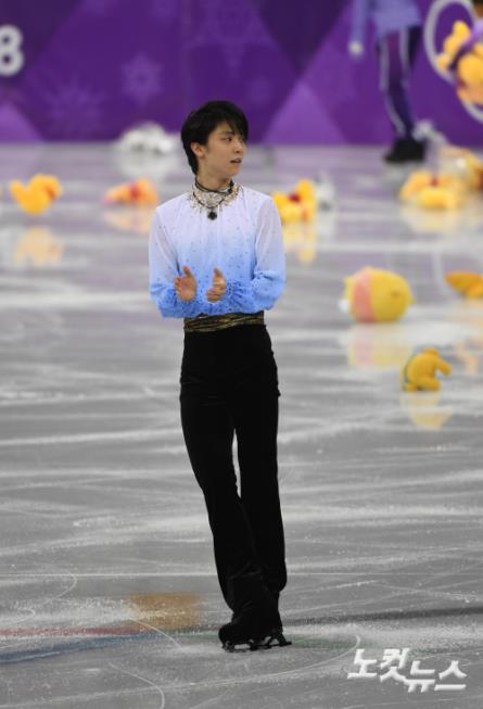 16일 강릉아이스아레나에서 열린 2018 평창동계올림픽 피겨스케이팅 남자 싱글 쇼트 프로그램에서 일본 하뉴 유즈루가 연기 후 인사하고 있다.