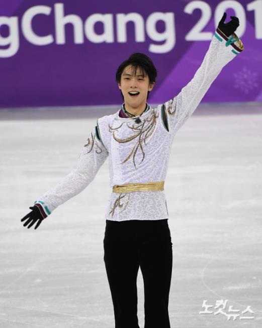 17일 강릉아이스아레나에서 열린 2018 평창동계올림픽 피겨 남자 싱글 프리스케이팅에서 일본 하뉴 유즈루가 연기를 마치고 환호하고 있다.