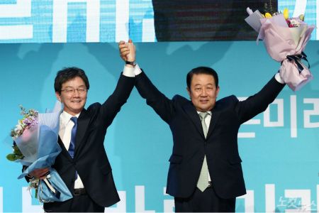 지난 13일 오후 경기 일산 킨텍스에서 열린 ‘바른미래당 출범대회’에서 공동대표로 추대된 유승민(왼쪽)-박주선 공동대표가 쏠다발을 들고 인사하고 있다. (사진=윤창원 기자/자료사진)