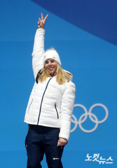 에스터 레데츠카(23·체코)가 동계올림픽 사상 처음으로 알파인스키와 스노보드에서 모두 금메달을 목에 건 선수로 이름을 올리고 24일 오후 평창 메달플라자에서 메달을 목에 걸고 기뻐하고 있다.