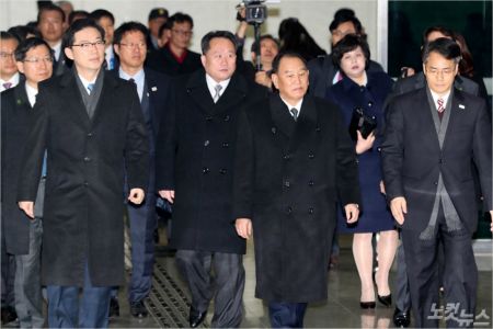 김영철 북한 노동당 중앙위원회 부위원장(통일선전부장)과 리선권 조국평화통일위원회 위원장을 비롯한 북한 고위급 대표단이 천해성 통일부 차관의 안내를 받으며 지난 25일 오전 경기도 파주 도라산 남북출입사무소를 통해 입경하고 있다. (사진=박종민 기자)