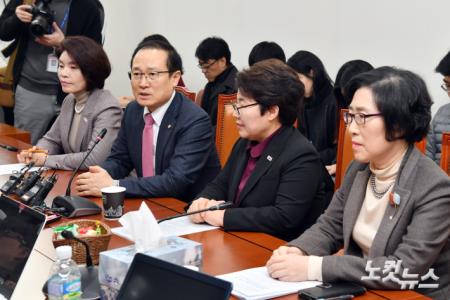 홍영표 환노위원장과 3당 간사들이 27일 국회 환노위원회 소회의실에서 근로시간 단축 법안 통과 관련 기자간담회를 갖고 있다.(좌측부터(더불어민주당 한정애 간사, 홍영표 위원장, 자유한국당 임이자 간사, 바른미래당 김삼화 간사)