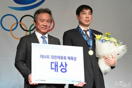 28일 서울 올림픽파크텔에서 제64회 대한체육회 체육상이 열린 가운데 체육대상으로 선정된 김민석을 대신하 수상자로 나선 아버지 김만수(오른쪽)씨가 이기흥 대한체육회장과 기념사진을 찍고 있다. (사진=박종민 기자)