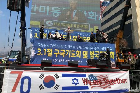 올해로 99주년을 맞은 삼일절 낮 1시. 서울 광화문 교보문고 앞에는 올해도 태극기와 성조기가 함께 나부꼈다. 최근 몇 년 동안 삼일절이 되면 시청 앞이나 광화문 광장에서 정치적인 성향의 구국기도회를 열어온 일부 보수 교계가 올해도 구국기도회를 개최했다.
