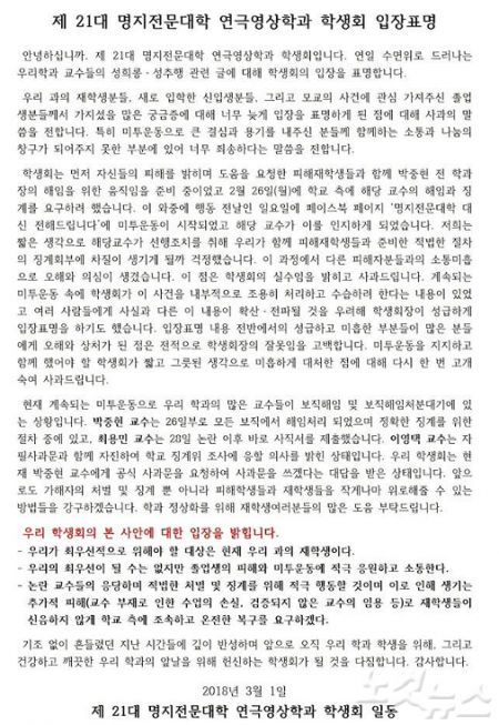 명지전문대 연극영상학과 학생회는 1일 공식입장문을 내고 "미투 운동으로 우리 학과 많은 교수들이 보직해임 및 보직해임처분대기에 있다"며 "가해자의 처벌 및 징계 뿐 아니라 피해학생들과 재학생들을 작게나마 위로할 수 있는 방법을 강구하겠다"고 밝혔다.