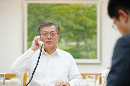 문재인 대통령이 1일 밤 도널드 트럼프 미국 대통령과 전화 통화를 하고있다. (사진=청와대 제공)