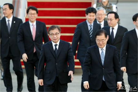 대통령 특사로 북한을 방문한 정의용 국가안보실장과 서훈 국정원장등이 6일 오후 서울공항을 통해 입국하고 있다. (사진=윤창원 기자)