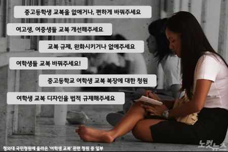 이에 청와대 국민청원 게시판에는 이미 여학생들의 교복 디자인을 개선하도록 해달라거나 치마와 바지를 혼용해 입게 해달라는 청원이 수십건 올라와있는 상태다.