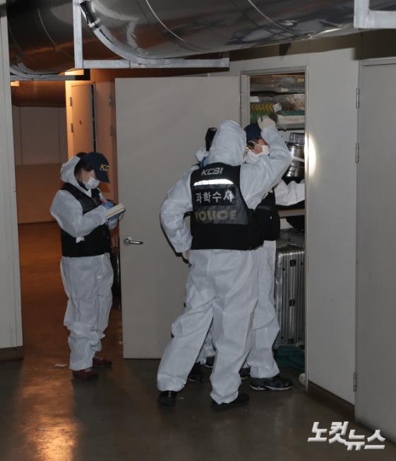 '성추행 의혹'을 받고 있던 배우 조민기가 9일 오후 4시 5분께 서울 광진구 구의동 한 오피스텔 지하에서 숨진 채 발견된 가운데 경찰 과학수사팀이 현장 감식을 하고 있다.