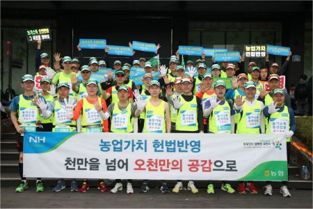 농협 임직원들은 '농가소득 오천만원 가즈아~', '농업가치 헌법반영 영미! 영미! 영미!' 라는 이색 등판을 달고 농가소득 5천만 원 기필 달성과 농업의 공익적 가치 헌법 반영을 기원하며 이를 악물고 달렸다.