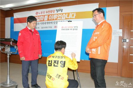 노동당 이장우 울산시당위원장, 민중당 김창현 울산시당위원장, 정의당 김진영 울산시당위원장(사진 왼쪽부터)은 22일 울산시의회 프레스센터에서 기자회견을 열고 후보단일화 합의내용을 발표했다. 합의문에 사인하고 있는 시당위원장들.(사진 = 반웅규 기자)